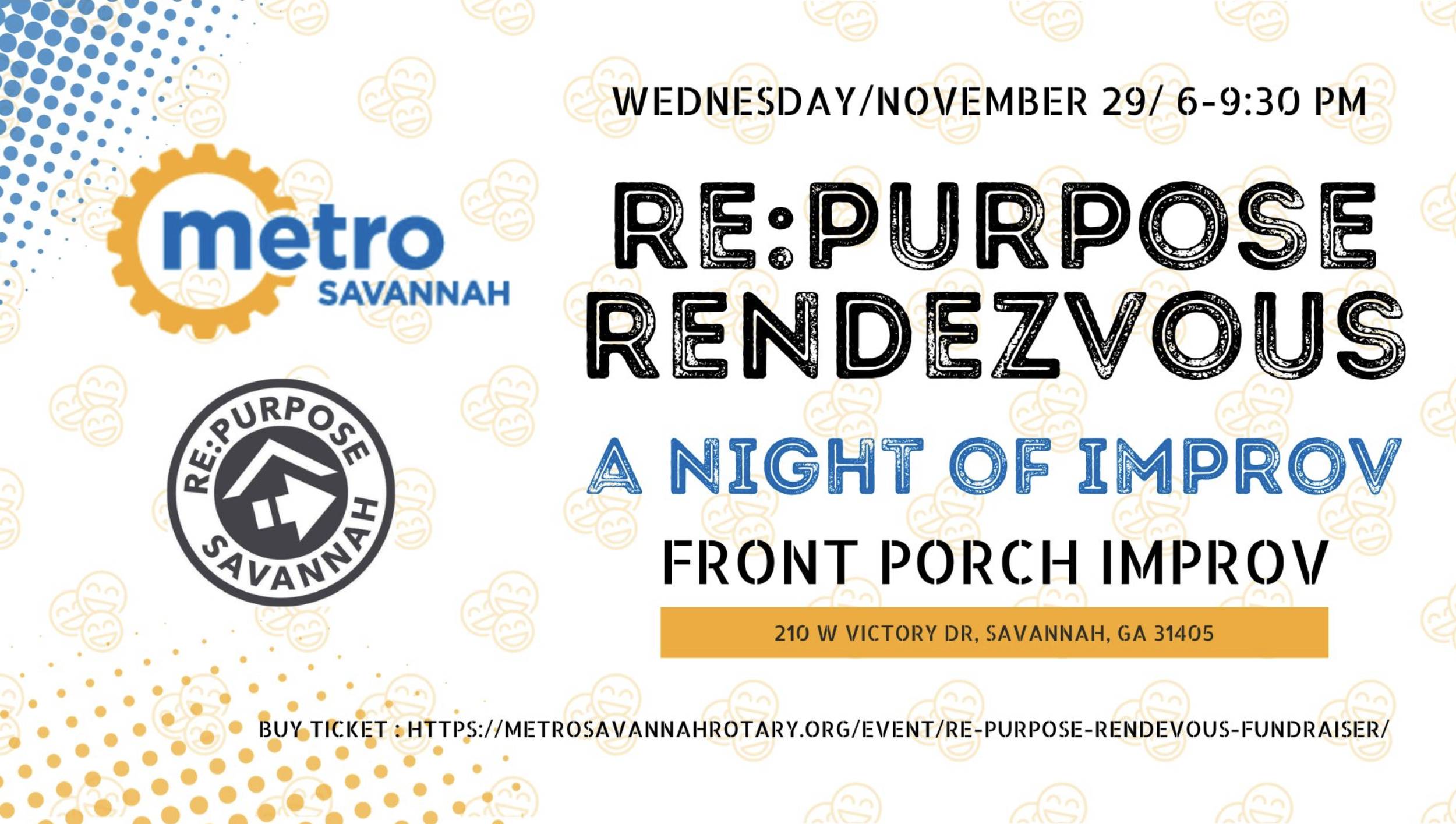 Metropolitan Savannah Rotary Presents "Re:Purpose Rendezvous" fall fundraiser benefiting Re:Purpose. Secure your early-bird tickets now for $50! The price will increase to $60 on 11/1 and will be $75 at the door (if any remain). Tickets include: 2 drink tickets, small bites and games by Front Porch Improv. We will also be raffling off amazing prizes.